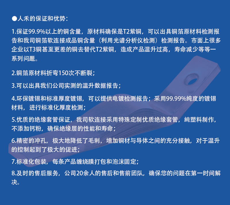 銅排軟連接采用T2無氧銅箔,經(jīng)分絲處理,通過高分子擴(kuò)散焊接,整體或表面可鍍銀或鍍錫。 材質(zhì):T2無氧銅 鍍層:表面鍍銀或鍍錫 接觸面:長度可按安裝要求設(shè)計(jì) 鉆孔:標(biāo)準(zhǔn)設(shè)計(jì)無鉆孔,可按圖紙要求定制 絕緣材料:標(biāo)準(zhǔn)設(shè)計(jì)無絕緣材料,可按要求使用PVC絕緣套管并熱縮固定 優(yōu)勢:我們是唯一一家既做軟連接,也做浸塑的企業(yè) 特殊設(shè)計(jì):可按圖紙要求定制 尺寸:按圖紙要求定制